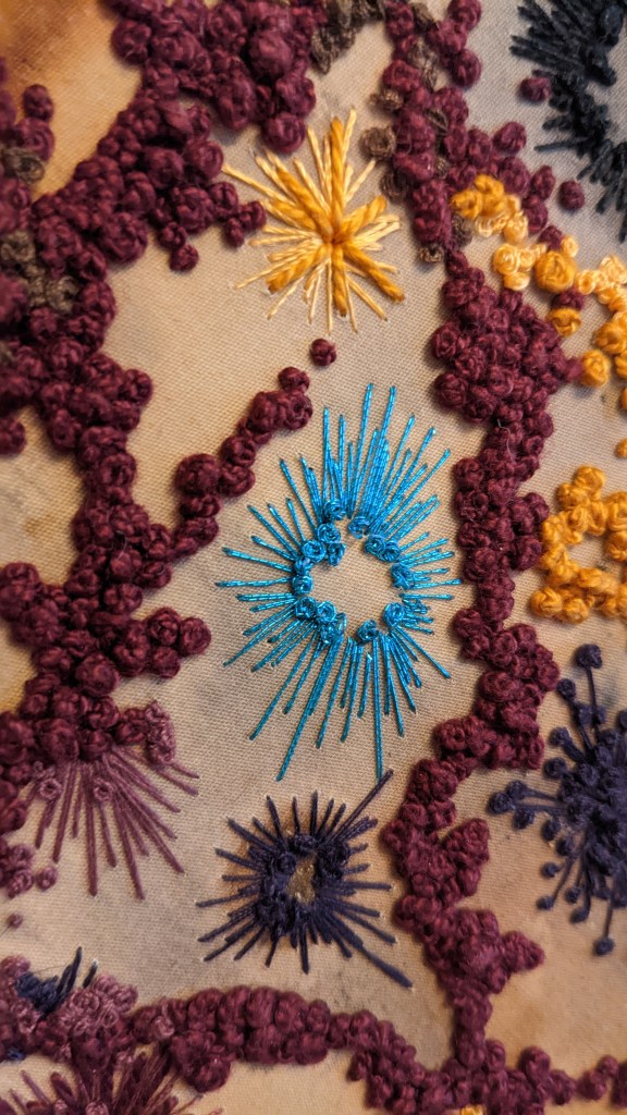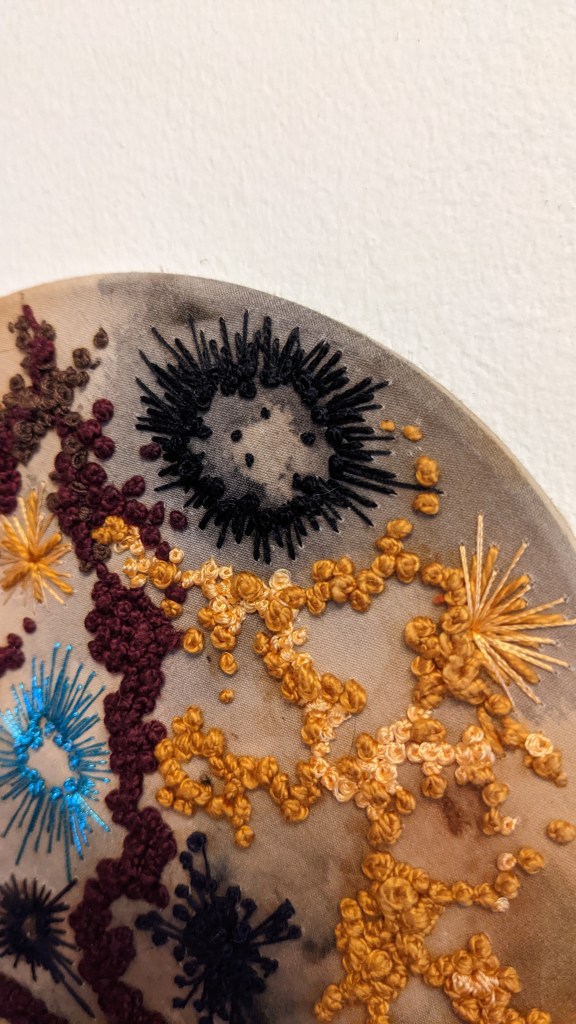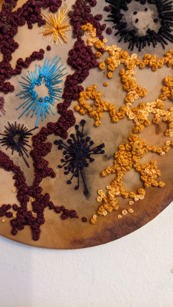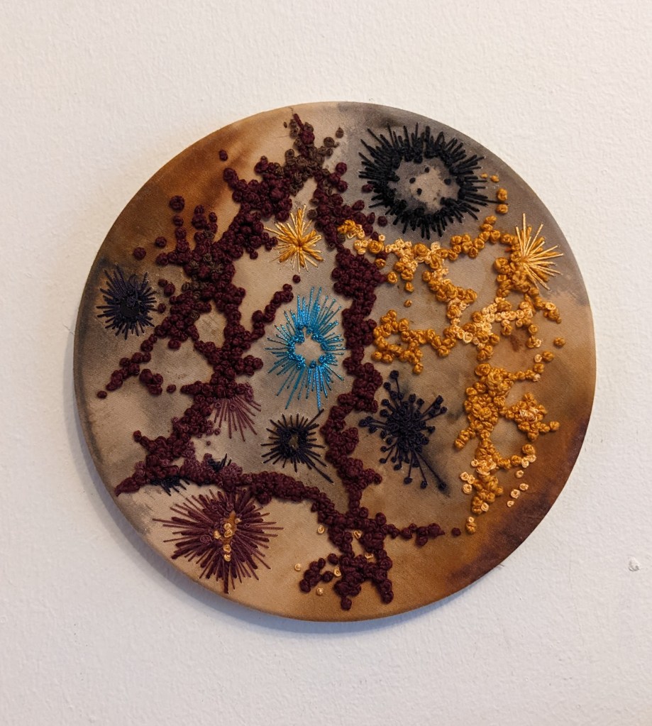 To capture this moment in time, I created some eco-dyed prints, using rust, red wine and some late wild blackberry leaves on some vinegar soaked re-cycled cotton. Over time the colours developed and with my organic embroidery I tried to explore the original experience in several pieces.